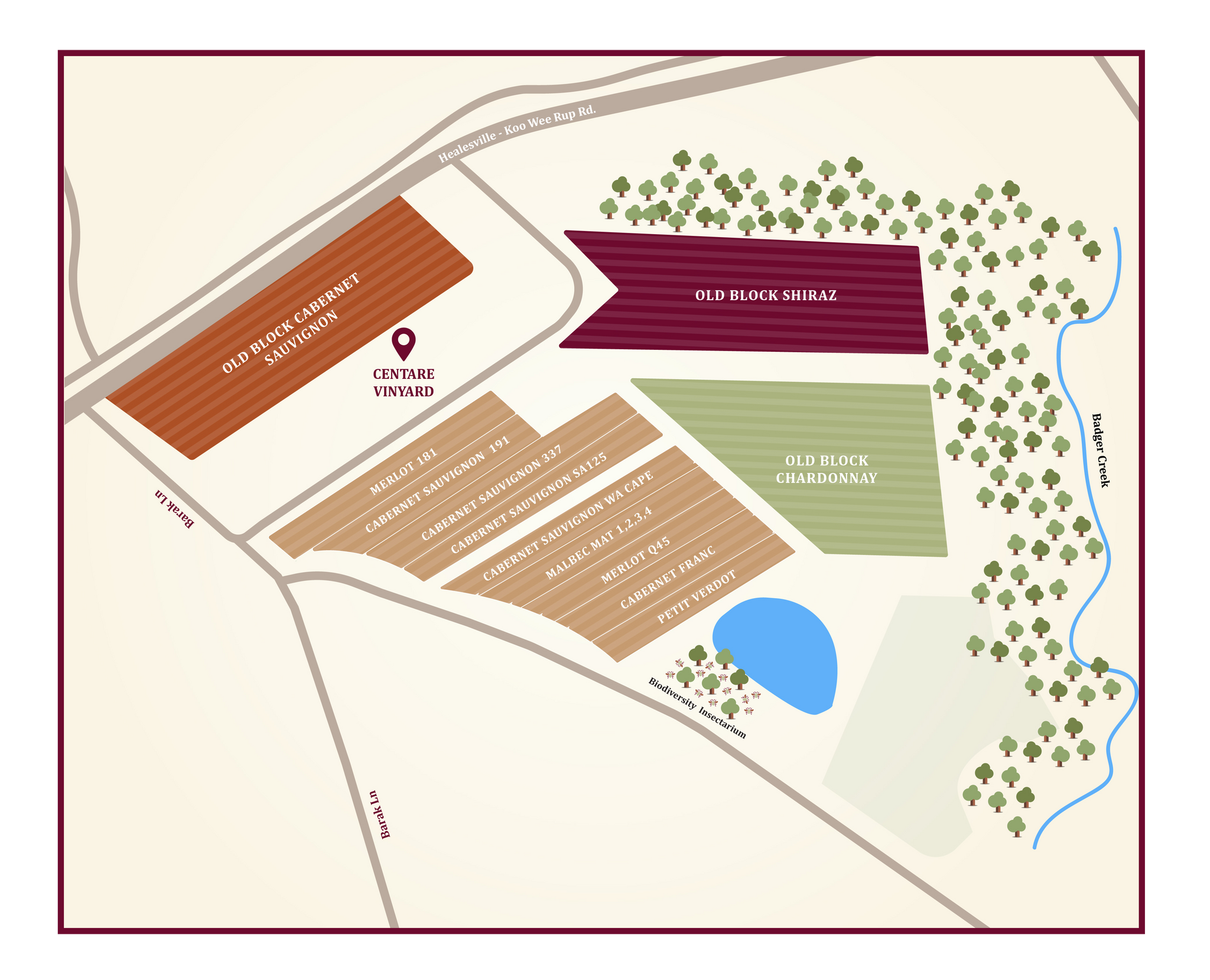 Today, approximately 2ha each of original, own-rooted, single block Chardonnay Clone I10V5, Shiraz Clone PT23 and Cabernet Sauvignon Clone SA125 own-rooted plantings remain to produce the Centare Vineyard Old Block vintage wines each year.